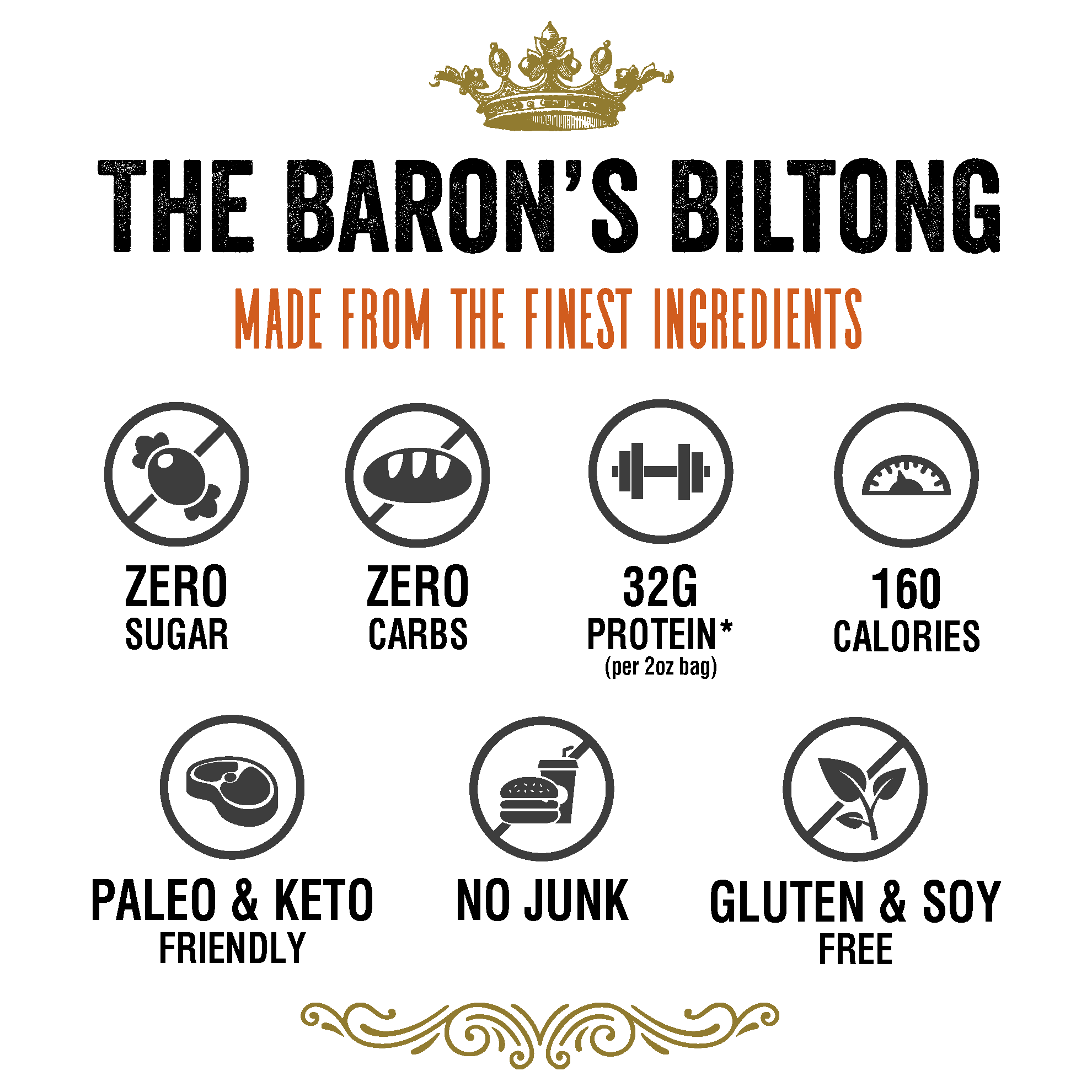 The Baron is a busy fellow - running the animal kingdom and all - and he knows just how hard it is to find quality food while on-the-go. That’s why he’s been uncompromising in creating his biltong, and the numbers speak for themselves. In case you need more convincing, 32g of protein and only 160 calories is the best protein-to-calorie ratio of any snack food on the market. This makes the Baron’s Biltong a perfect post-workout snack to maximize your hard earned gains! Besides, don’t you think "high-carb meat" should be a total oxymoron?! Our “friends” in the jerky business don’t seem to agree. With 0g of carbs and 0g of sugar, our biltong is the perfect snack for a Keto, Paleo, Whole30 and Low-Carb diet.